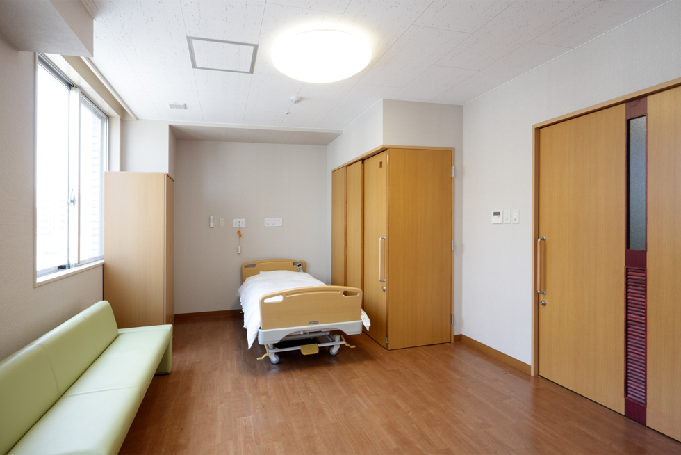 既存病院の1層分を改修して、21床の緩和ケア病棟を新設しました。4床室だった病室を2分することで個室とし、すべての病室に便所を設けました。共用のスペースには、誰もが使えるオープンキッチンがある食堂と、栗林公園を見渡すことのできる大きな窓を新設したラウンジを設けました。